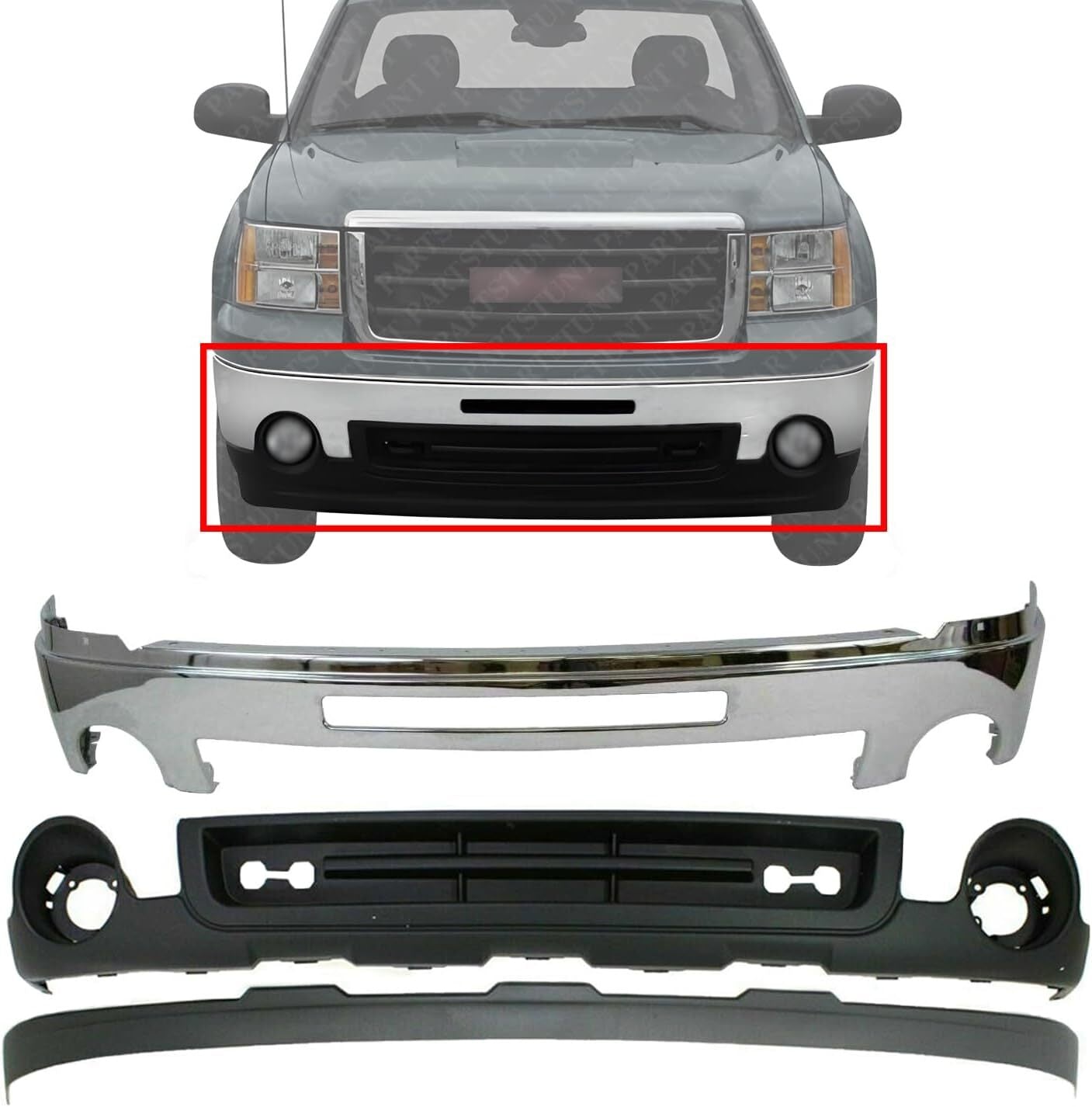 Front Bumper Chrome With Air Hole + Lower Valance Air Deflector and Extension Textured For 2007-2013 GMC Sierra 1500