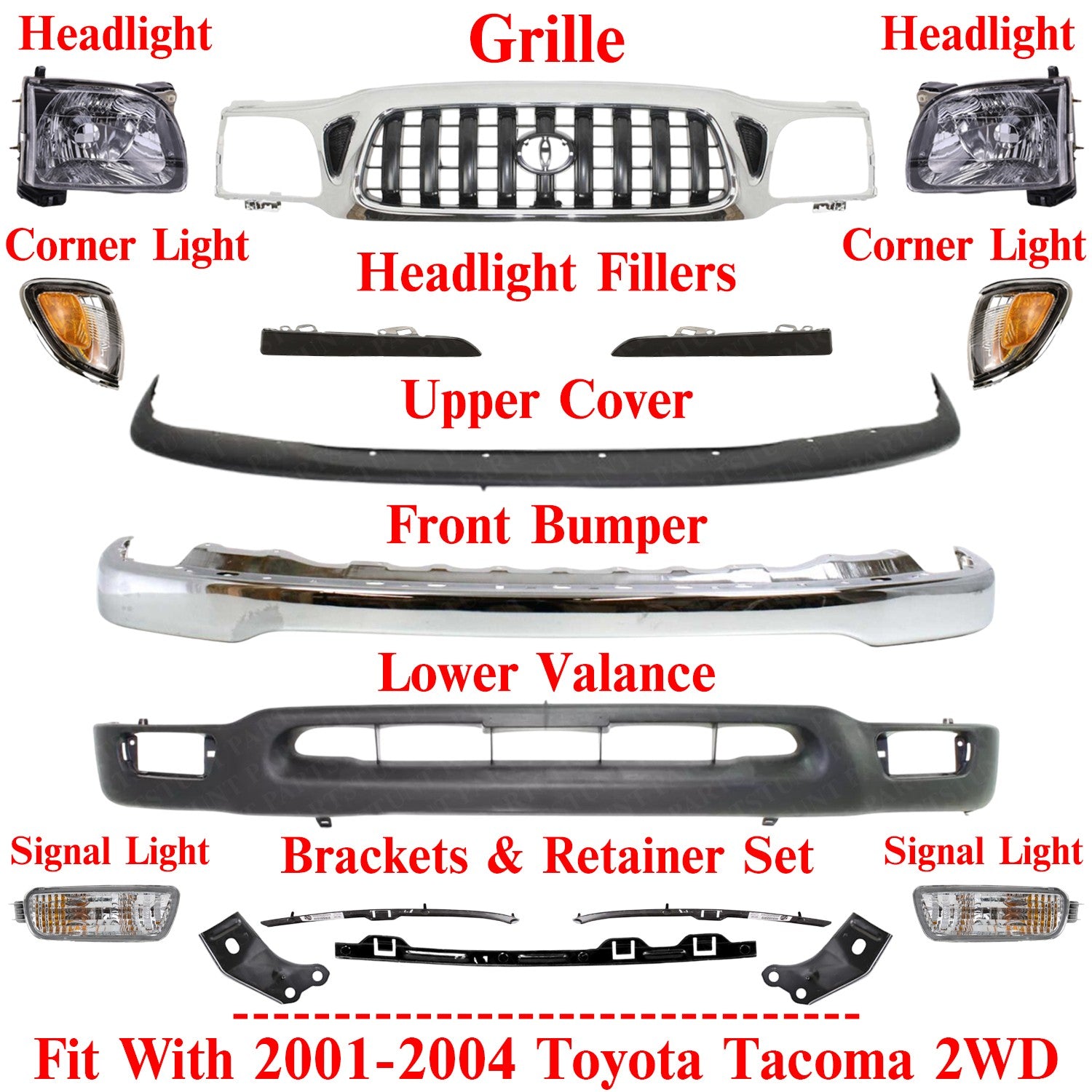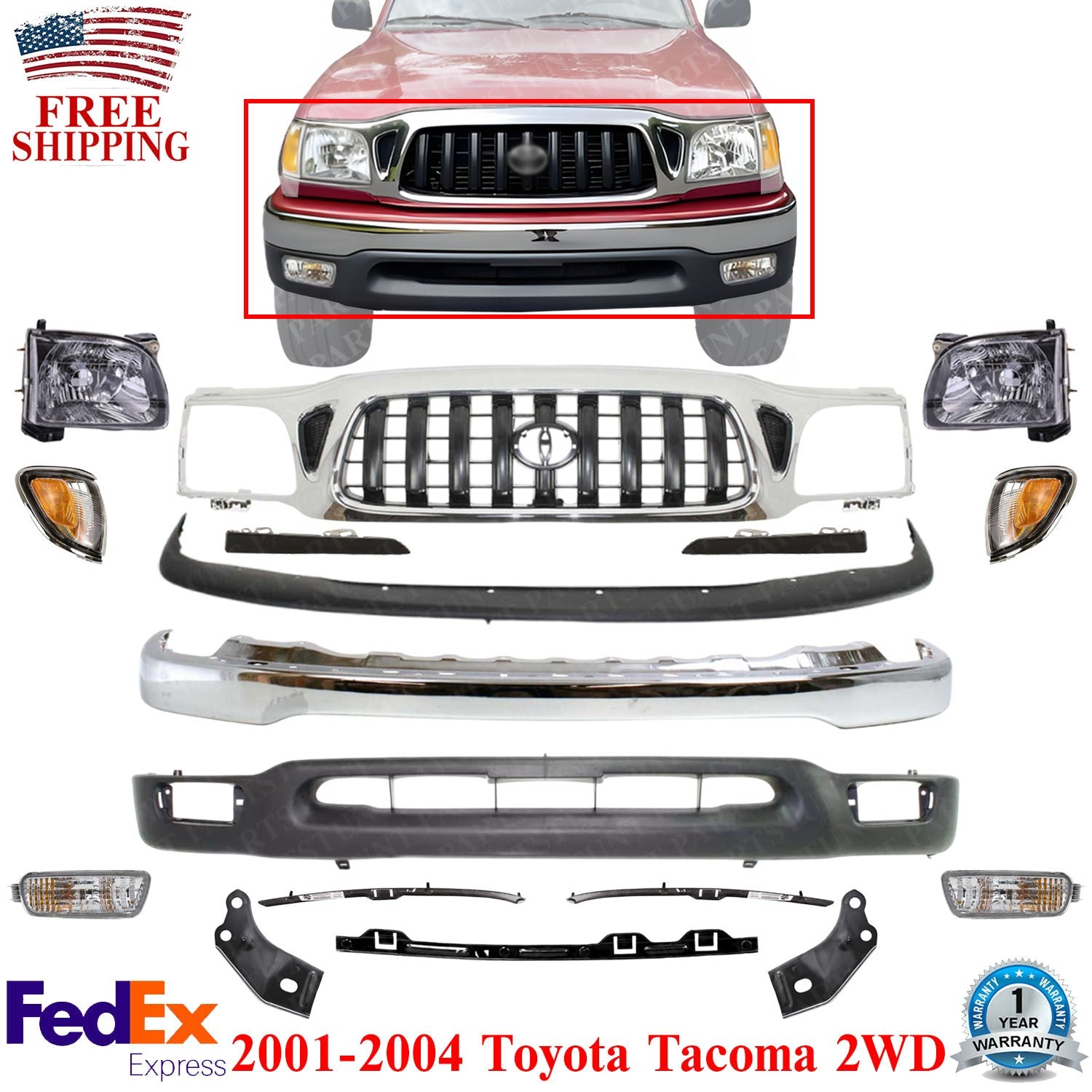 Front Chrome Bumper + Grille + Headlights Kit For 2001-2004 Toyota Tacoma 2WD