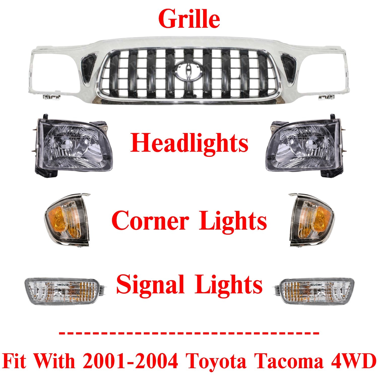 Front Chrome Grille + Headlights + Signal Lights For 2001-2004 Toyota Tacoma 4WD Partlink Number: TO1200248...